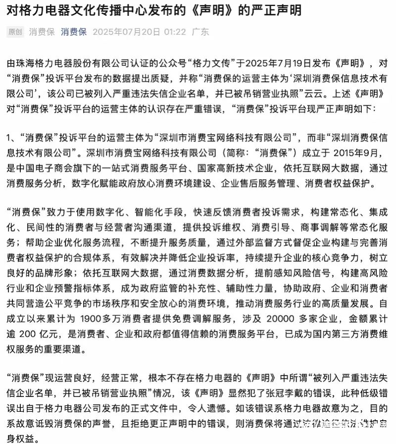 7月19日晚间,格力文传发文称:近期,我司发现网络上有自称“消费保”的投诉平台发布了关于家电企业售后投诉量及解决率对比排行,相关内容已被中华网财经等媒体引用传播。经核查,该平台是民间机构,并无官方资质,该排名数据来源、统计方法不透明,缺乏客观依据与公信力。