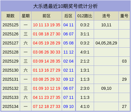 最近10期奖号数据统计表