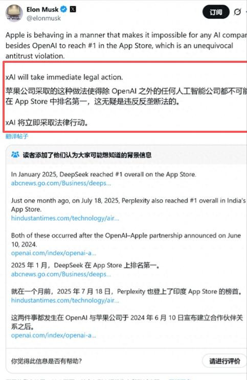 因为自家 AI 儿子 Grok 在苹果 App Store 里没拿到第一名,也没有被选进必备 App推荐位,气不过的老父亲直接把苹果和 OpenAI 告上了法庭。
