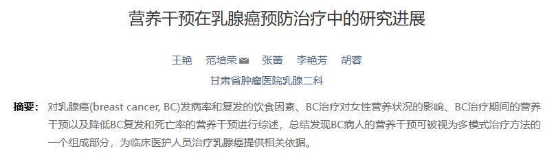 [1]王艳,范培荣,张蕾,等.营养干预在乳腺癌预防治疗中的研究进展[J].全科护理,2024