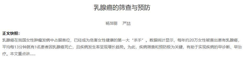 [1]杨萍丽,严喆.乳腺癌的筛查与预防[N].甘肃科技报,2024